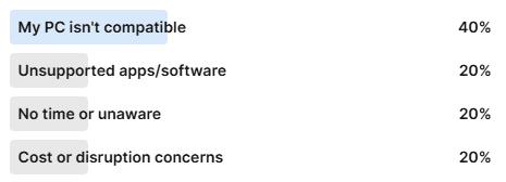 Ahead of the end-of-support for Windows 10, I ran a LinkedIn poll to ask: why haven’t you upgraded yet? Bear in mind it was a